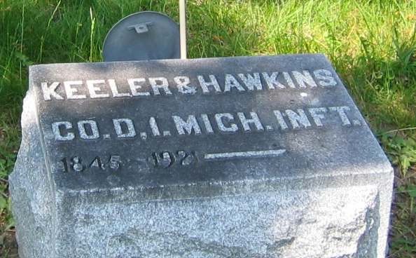 But wait! The headstone plainly reads Keeler and Hawkins, with CO.D.1.MICH.INFT. clearly below the names. Despite all the discussion, I find it hard to believe that Keeler would have placed Harrison’s unit on the headstone if it wasn’t his also—especially since no life dates (1843-1908) were ever added for Harrison. Keeler’s dates are under his name—1845-1921. PENSION PAPERSWe find the following in one of the pension papers