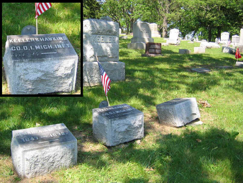 The life of Harrison Hawkins, father of our family’s grandfather Mont E. Hawkins, was not nearly as well-known in the family as the ancestors of the daughter-in-law he never knew, Fern Porter Hawkins. In fact, until 1992, we didn’t even know that his name was Harrison. An inquiry a few years earlier at Grand Rapids’ Greenwood Cemetery where he is buried offered the name “Hanson,” which later proved erroneous. And only recently have we discovered that our grandfather himself was an eighth generation of Hawkins to be born in America. You can read about that in the “American Hawkinses.” We knew that Grandpa Hawkins’s father had fought for the Union in the Civil War. His Company identification is right on his headstone (Company D, First Regiment, Michigan Infantry), and I remember visiting his grave with my grandfather when he was still alive. A vet spike was always by the headstone. But it wasn’t until September 1992 when a request to the National Archives produced all the papers in his pension records that we learned factual data about him and his life. Read about that and a fairly complete account of his experience in Civil War history in “Harrison’s Civil War Service.” FAMILY ROOTSHarrison had been born in Starkey, Yates County, western New York on August 1, 1843, the fourth of eleven children. Records are confusing about his siblings and exactly when his family moved to Jackson County, Michigan, southwest of Lansing, but they did. More on that is written up elsewhere. Florence Huntley’s family was already in Jackson County when she was born in November 28, 1854. For a long time, we struggled to find information about her family of origin, but we finally did—see “Finding Florence’s Roots,” including the decades-long confusion about her father’s name. Florence’s father, Isaiah Huntley, was born in Ohio in 1832, one of ten children. Her mother, Maryette Thompson, the youngest of fourteen children, was born in 1833 in Chenango County in south central New York. At some point both of those families moved to Jackson Country, Michigan, and that’s where Isaiah and Maryette were married in 1852. Ancestry gives Florence’s birth as 1853, but her headstone clearly shows 1854.
