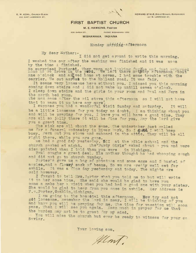 M. E. Hawkins Letter to His MotherFlorence Huntley Hawkins Waite, following the death of her second husband, William Waite, had lived with her son Mont E. Hawkins and his family in Mishawaka, Indiana, for a time. Florence was 72 and apparently in good health, good enough that she was able to make a trip back to Michigan. The envelope carries a street address in Grand Rapids (147 Bowne Street N.E.), which provides a bit of mystery. Late in the letter we learn Florence was visiting her sister. Her sister Ida had died thirteen years earlier, but her sister Laruka was still alive. Laruka, younger by twelve years, would die three years later but in Pierson, northeast of Grand Rapids where Grandpa Hawkins was born and where his grandparents (parents of Florence and Laruka) died. Was Laruka living in N.E. Grand Rapids in 1926, and is that whose household was so “jolly”? Also mysterious was where Florence was going to be on Monday that she would be so “lonely.” In fact, he mentions loneliness twice. Interesting to speculate …. I also wonder how long she expected to stay since they put her stove and “cuboard” in the attic. And did she do her own cooking while living with the Hawkins? She was back in Mishawaka on November 27 of that year when she had a stroke and died two days before her birthday. When I read this letter, I picture the family in the only house I knew Grandpa and Grandma Hawkins in, the one at 1012 Charlotte Street. That may or may not have been the case. It occurs to me that I don’t know when they moved into the house on Charlotte, and if I don’t know, I’m afraid no one else is left who would know. But maybe I know more than I realized at first. What I do remember is Porter grandson Lyman Wood telling that during the 1920s, Grandpa and Grandma Porter lived in Mishawaka for a while (several years?) and that Grandpa Porter built four houses, including the one on Charlotte Street. Lyman knew this because his parents had taken over the 16th Street farm and he had lived in the brick house while the Porters were gone. He may have even said he attended the old schoolhouse. With this 1926 letter written right in the middle of the ‘20s, it’s hard to figure out whether the Porters lived in Mishawaka before or after the letter. If I had to guess, I’d say before—in other words, the Porters moved to Mishawaka not long after the Hawkins family moved there from Hastings. Hawkins son Paul was born in Mishawaka in 1921. With Lyman born in 1914, if he attended the old schoolhouse, it had to have been in the early ‘20s. Something else to wonder about is how farmer Ferd Porter knew how to build two-story houses…? The letter is written on a typewriter and fills almost a full page. It is interesting to think about someone born in 1880 being able to use a typewriter well enough that he chose it over handwriting. There are a few typos, but most of them are fixed. I’m impressed with how good the spelling and punctuation are—not perfect but very good for that day and time. The letter is on a letterhead of the First Baptist Church in Mishawaka with Grandpa’s name under the church name and under that an address of 609 Sarah Street and a phone number of Mishawaka 1590. That is another bit of mystery because the church is on Main Street, not Sarah Street. I’ve wondered if the address and phone were for Grandpa’s house, not the church, or perhaps the big church on Main hadn’t been built yet? Yet it held 511 on a Sunday morning…. There is a signature below the closing, and I recognize it as his handwriting. I just noticed it is followed by a strong period, which could be confirmation that his name was indeed Montell, even though I never heard that during his lifetime.