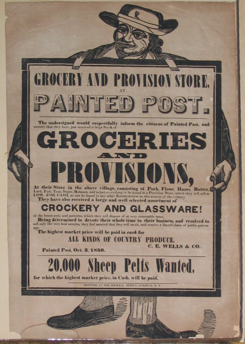 Great-grandmother Hannah Compton Wells died in April 1888, two months before her 67th birthday. Her great-granddaughter, my grandmother Fern Hawkins, wasn’t born until six years later. Consequently, not much of substance was carried down through the years about this ancestor. In fact, the only times her name came up in my hearing two generations later was in mention of a bad trait in the family—"She must have gotten that from Great-grandmother Wells." Since I'm quite sure you didn't deserve that, Grandmother, may I offer our collective apologies? (That family habit has not continued in my generation.) Obtaining the quotes from her Bible in 1951 (see Hannah’s Bible) gave us information about her no one had had before. What struck us as most interesting at that time was the information about her grandfather who died in the American Revolution and his ancestor Spencer Compton who had died in 1643 fighting the Parliamentarian forces that ousted England's King Charles. (Hannah's Bible called them "Cromwell's forces," but we now understand that Cromwell did not come into the picture until a few years later.) Husband CharlesHannah Marie Compton, the youngest of the eleven children in her family, was my third great-grandmother. While we’ve had plenty of information about the Comptons down through the generations, we’ve had only scraps of information and speculations about C.E. Wells, the man Hannah married. As recently in March 2012, that was about it. I knew that from some census work my nephew/webmaster had gained a few clues about C.E.’s family and roots, and I encouraged him to write up at least what he knew at that point. In the end, he wrote me two pages, and that research turned up some significant things about his life and Hannah’s. We now know that his name was Charles, that his family had also lived in Tyrone when he was growing up, and that he had as many as three brothers and five sisters. You can read here the full story of how Matt sorted out that mystery: C.E. Wells. So Charles and Hannah had sizable extended families on both sides, not just the Comptons. Since Charles’ father and his family were in Tyrone by the time he was ten or eleven, it is possible he and Hannah knew each other quite well while growing-up. Since Charles was seven years older than she and she was less than sixteen when they married, it is possible he did some waiting for her to grow up—just as another young man would do for one of their daughters years later. Though we have a lot more to learn about Charles’ siblings and what happened to his mother, it has been interesting to learn that he and Hannah had a large family on both sides during their years in Tyrone, New York. Gaining and Losing FamilyCharles and Hannah had been married three years and their first baby, Marcia Almira, was eleven months old in the late summer of 1840 when illness (we assume) struck the community. First, her brother David’s fourteen-year-old daughter, Effie, died. Within ten days, four younger nieces and nephews also died. Her brother William and his wife lost two on the same day, and they buried them in a common grave. Four of those who died are buried in a little cemetery on what would become Donovan Hill. Her brother Peter also lost a little girl, age two, but she is buried in the old cemetery at Sugar Hill where two siblings had been buried years earlier. Even though the Wells family escaped the death angel (perhaps the epidemic did not reach as far as the town of Tyrone), it is hard to imagine what a tragic and emotional time it must have been for the whole family. Hers and Charles’ second baby, Marion Elizabeth, was born in November of that year, 1841. The same month she was born, her Aunt Annie’s tenth child, Seymour Runyen Lockwood, turned ten. How soon everyone started calling her Minnie is unknown, as well as how long it was before cousin Seymour took a shine to her and decided he would wait for her to grow up. More on that in a moment. Charles and Hannah’s third child, in 1843, was another girl, and she became my great-great-grandmother. For a while, we weren’t sure if her name was Roxana or Roxanne, Sophrona or Sophronia, or indeed which of the two came first, but we now know from the Stauffer family Bible that is was Sophrona Roxana. And we’ve recently discovered that one of Charles’ brothers married a lady named Roxana, so there is the possibility that had something to do with Charles and Hannah giving the name to their daughter. Apparently she was known as Roxy most or all of her life (perhaps from the beginning to distinguish her from her aunt?), and that is the name on her tombstone. Moving onIn 1846, the family moved from Tyrone, in Schuyler County, New York, a bit further south to Painted Post, in Steuben County. We haven’t found anything on why they made that move. Two years later, another sister was born. They named her Mary Jane, but she would go through life as Jane. She would grow up to marry the younger brother of the man Roxy would marry—but that is another story (see Samuel Stauffer). In Painted Post—and likely in Tyrone, Charles appears to have supported his family as a grocer. A descendant, Marilyn Averill Towar of Flint, Michigan, and a great-granddaughter of Roxy’s (I’m a great-great-), had a tray that had been in her family for years. When she removed the picture on the surface, she found underneath two family treasures that had been used for lining the tray. One was an artist’s sketch of Painted Post and the other a grocery poster with Charles Wells’ name on it. The poster is fascinating reading all the way through, and it reveals a lot of the Charles’ character and the world they lived in. In 1854, after six years in Painted Post, the Wells family came to the huge decision to make an even greater move. They set out for Michigan. Marcia was 15, Minnie 13, Roxy 11, and Jane 6. Had young Seymour Lockwood decided by then that Minnie was the girl he wante